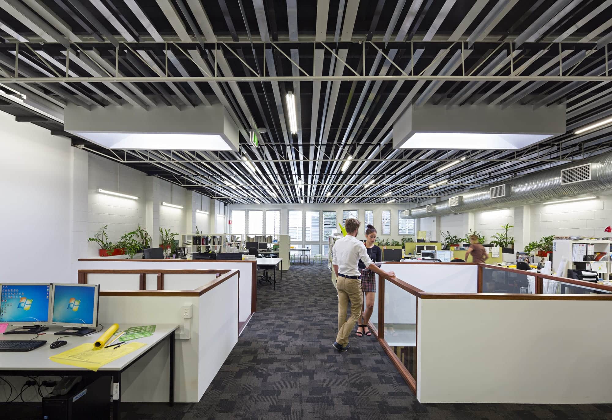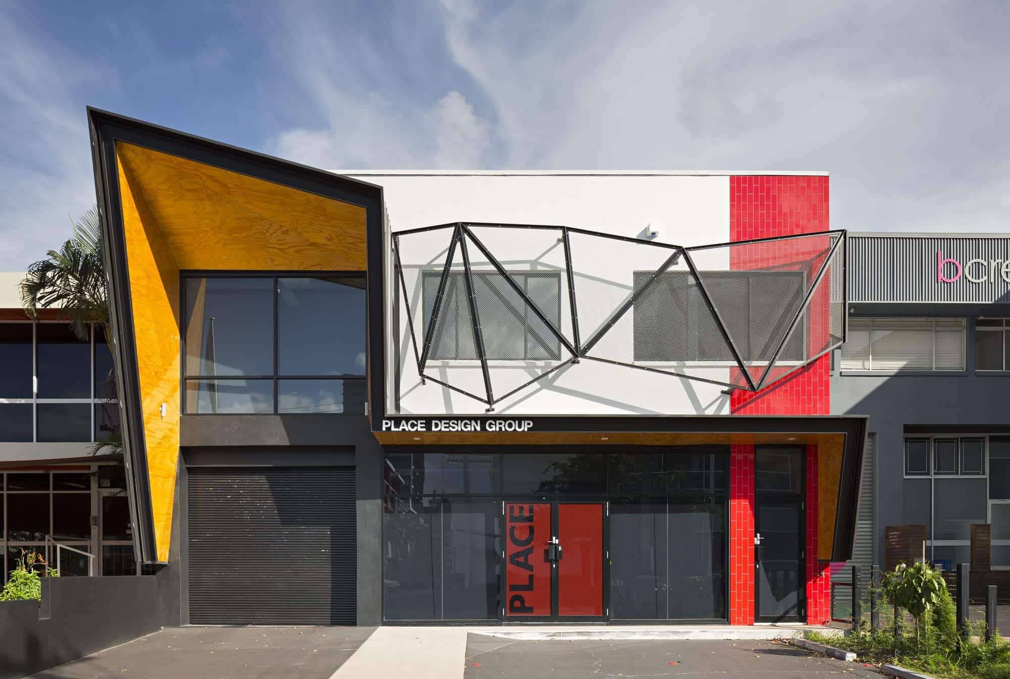 Set on a semi-industrial side street in Fortitude Valley, this project gives a new lease of life to an existing commercial premises. The intention of the project was to give a funky yet professional face to a business, and to provide transparency and lightness to the internal spaces. There is a strength in the facade with bold colours and forms, reflecting the energy of the street. The building also housed two different tenancies, so while the main tenancy is addressed through a larger folded roof form, the secondary tenancy is highlighted with a vibrant red tile. This brash exterior begins to warm with natural materials and filtered transparency once you enter the building, giving a warmer sense of comfort for the workspaces inside.