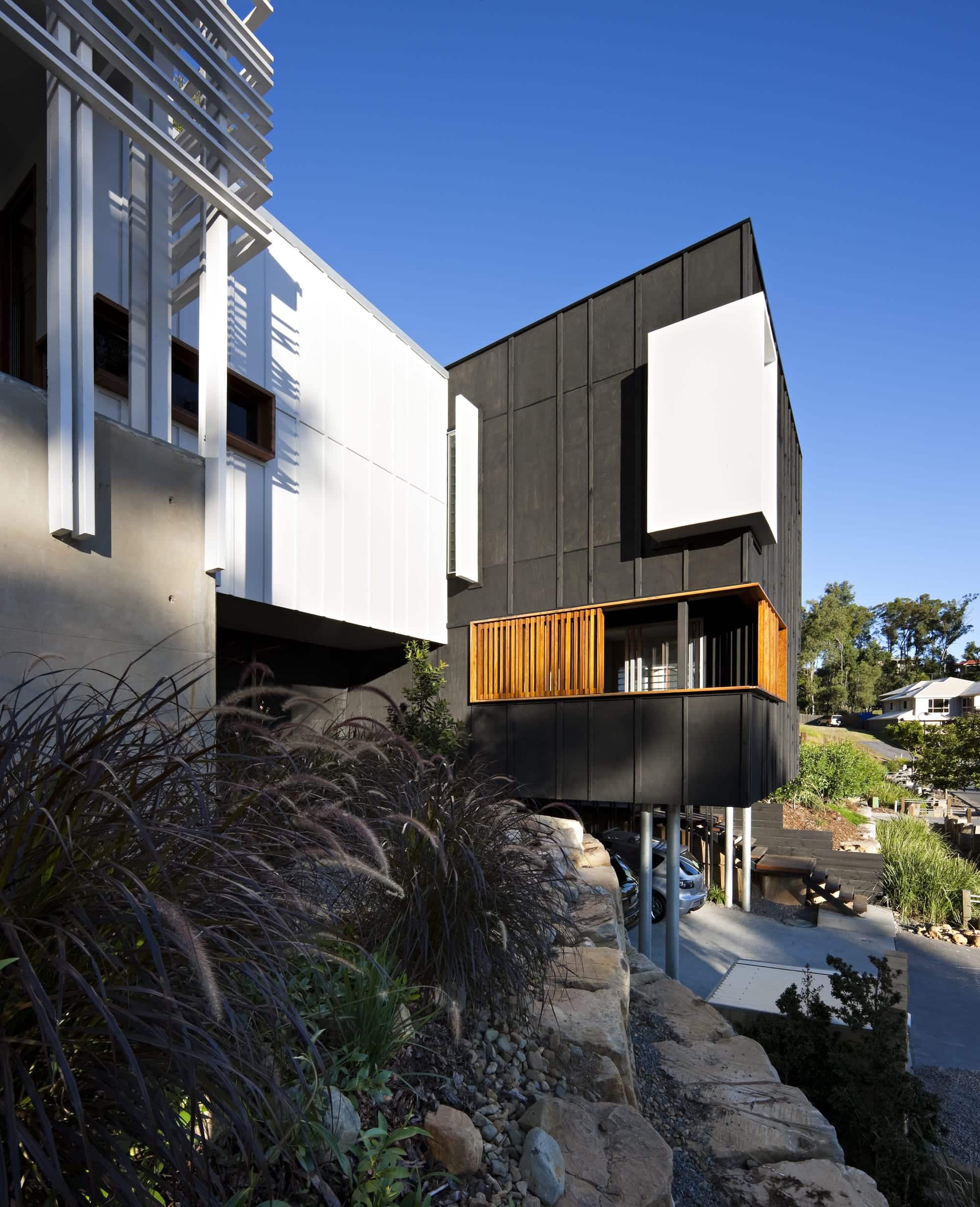 Stonehawke is wedged into the side of a hill and nestled into a large parcel of heavily wooded environmentally protected land. The home is designed as a charred box protruding horizontally like fallen lumber. Solidly grounded into the site, the body of the house wraps itself around an ‘out of ground off-form concrete pool’ that also reflects the charred timber in its internal finish.