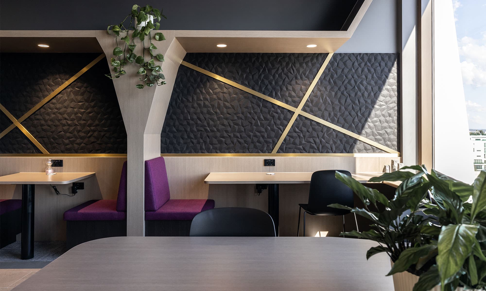 A modern, warm colour scheme has created a comfortable and pleasing work environment and multiple spaces including booths, nooks and meeting rooms provide a range of options for users.